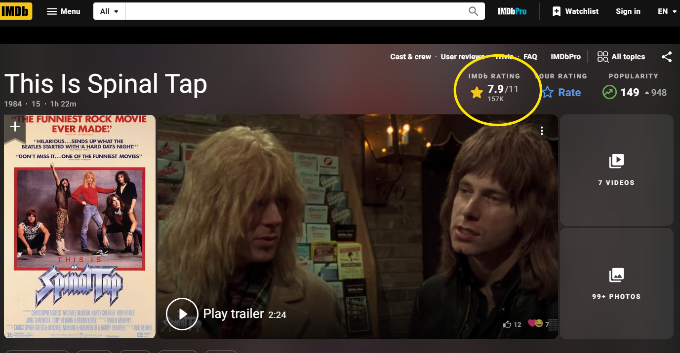 This Is Spinal Tap is a mockumentary movie about a fictional British self-centered rock band whose ambition is huge, while their talent is questionable. They are accompanied by Reiner who plays a journalist, interviewing them as they tour, on stage and off. One funny scene is when the guitarist of the band brags about how his Marshall guitar amplifier goes from 0 to 11, while other band’s amplifiers end at 10, thus making Spinal Tap’s amplifiers “extra louder”. The journalist then asks “but can’t you just make the 10 louder?” – funny stuff.